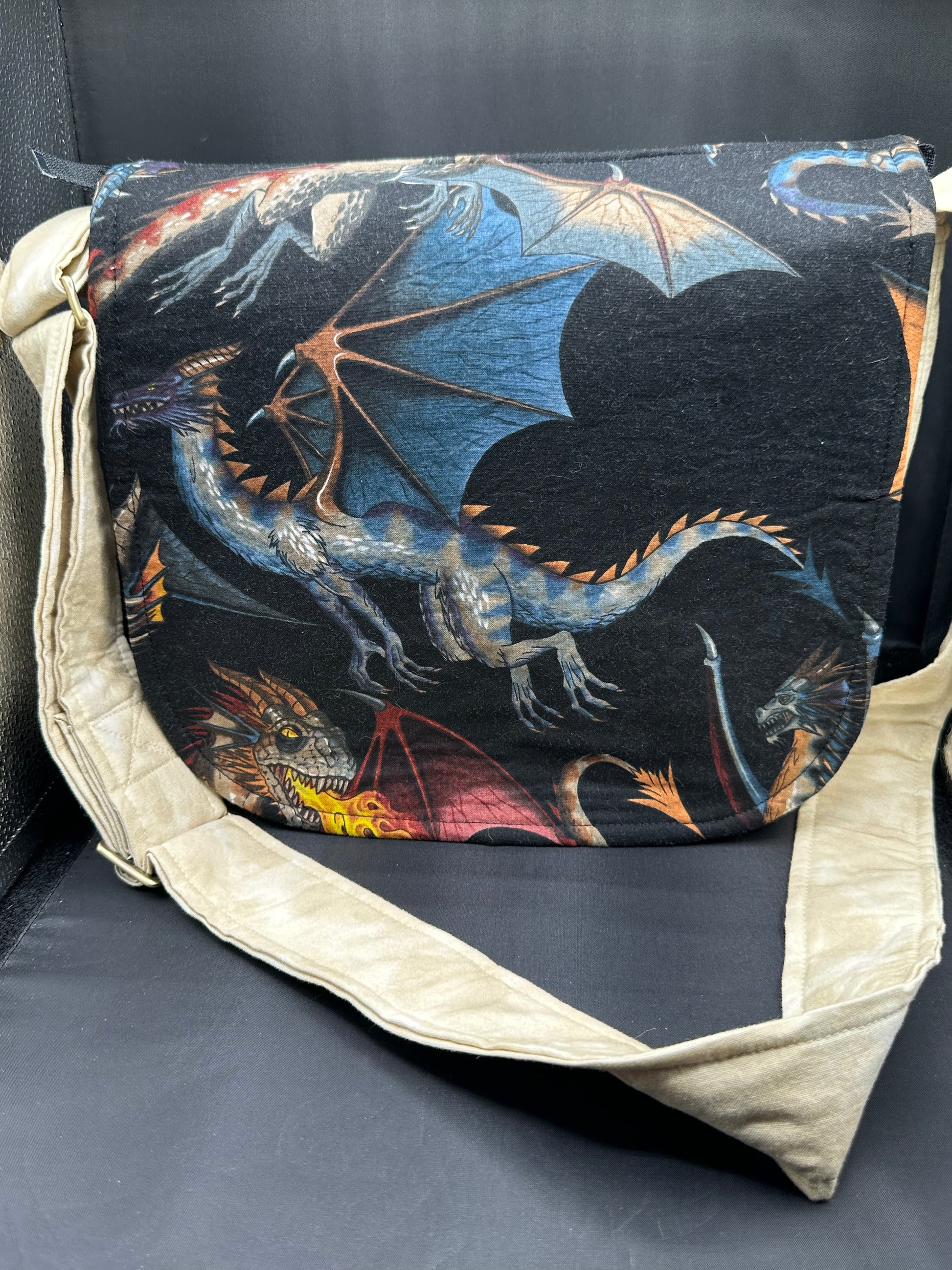 Bags finished size are approximately 13 inches wide by 10 inches. All bags have a main pocket and 4 interior pockets with an outside pocket that has the magnetic snap. All bags have zippers to allow the flap to detach and be replaced with another flap while not changing the main body of the purse.