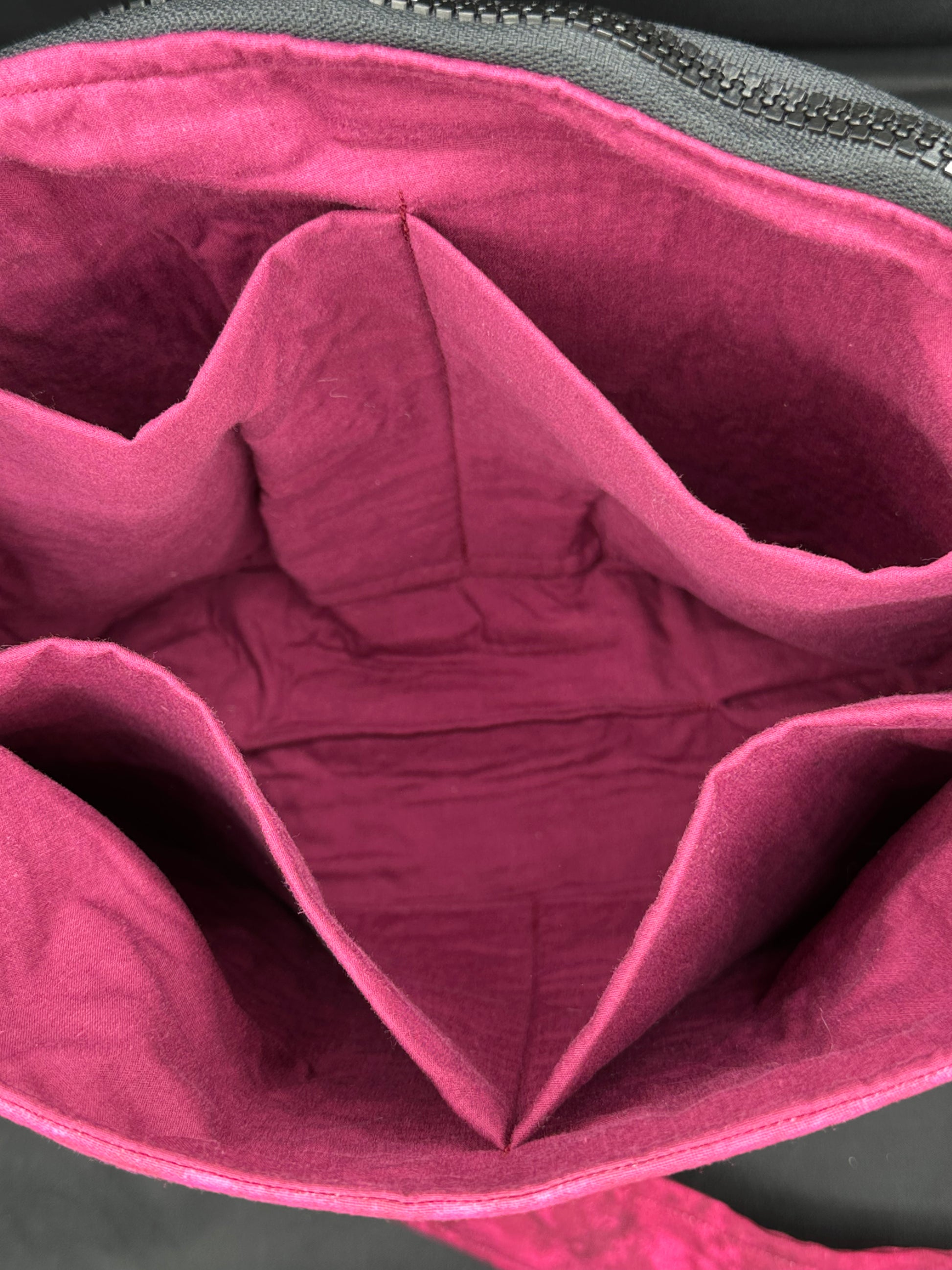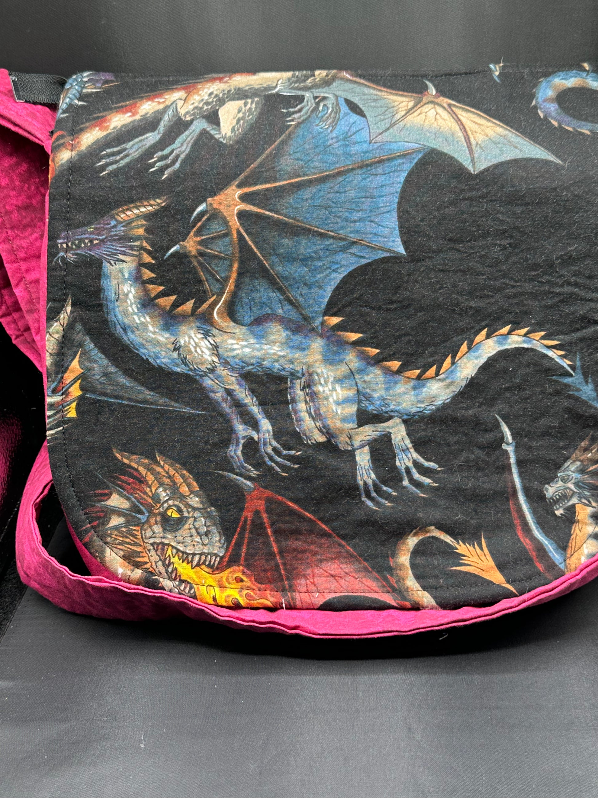 Bags finished size are approximately 13 inches wide by 10 inches. All bags have a main pocket and 4 interior pockets with an outside pocket that has the magnetic snap. All bags have zippers to allow the flap to detach and be replaced with another flap while not changing the main body of the purse.