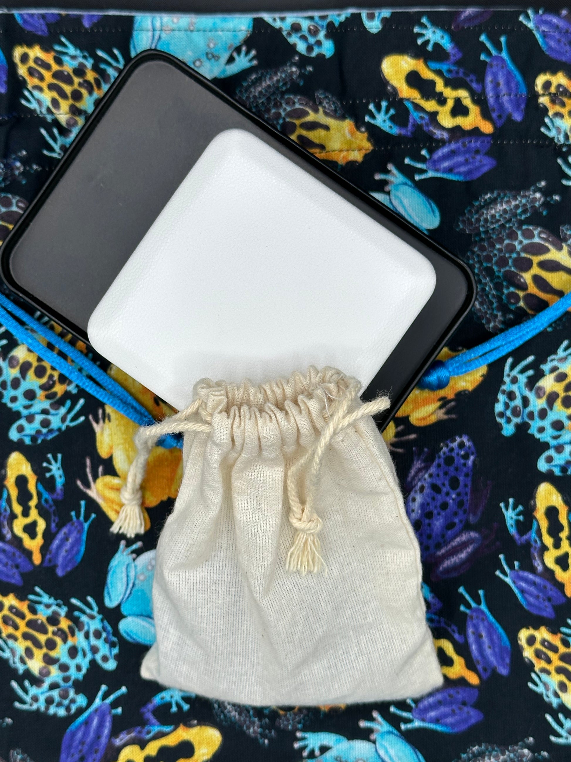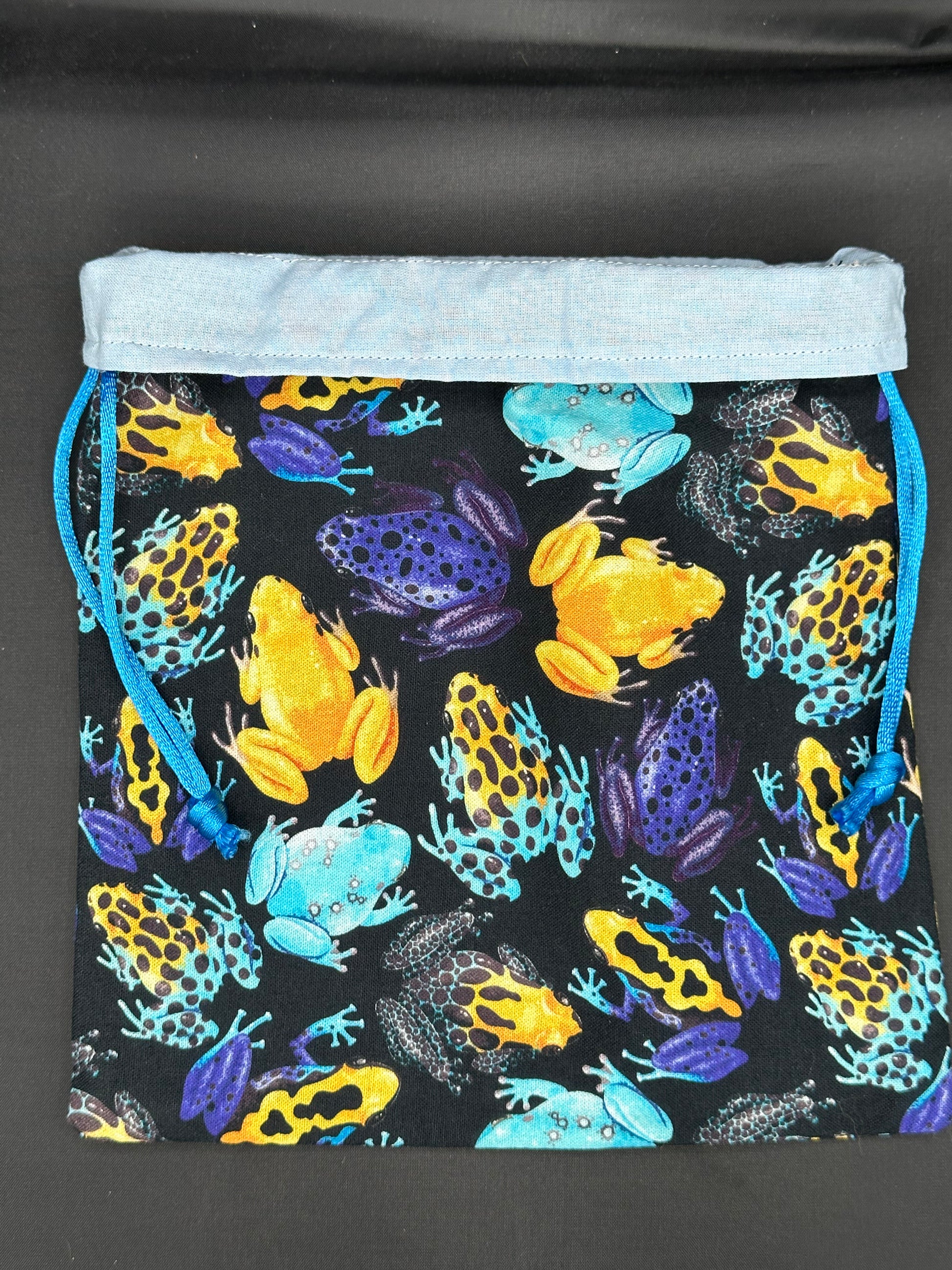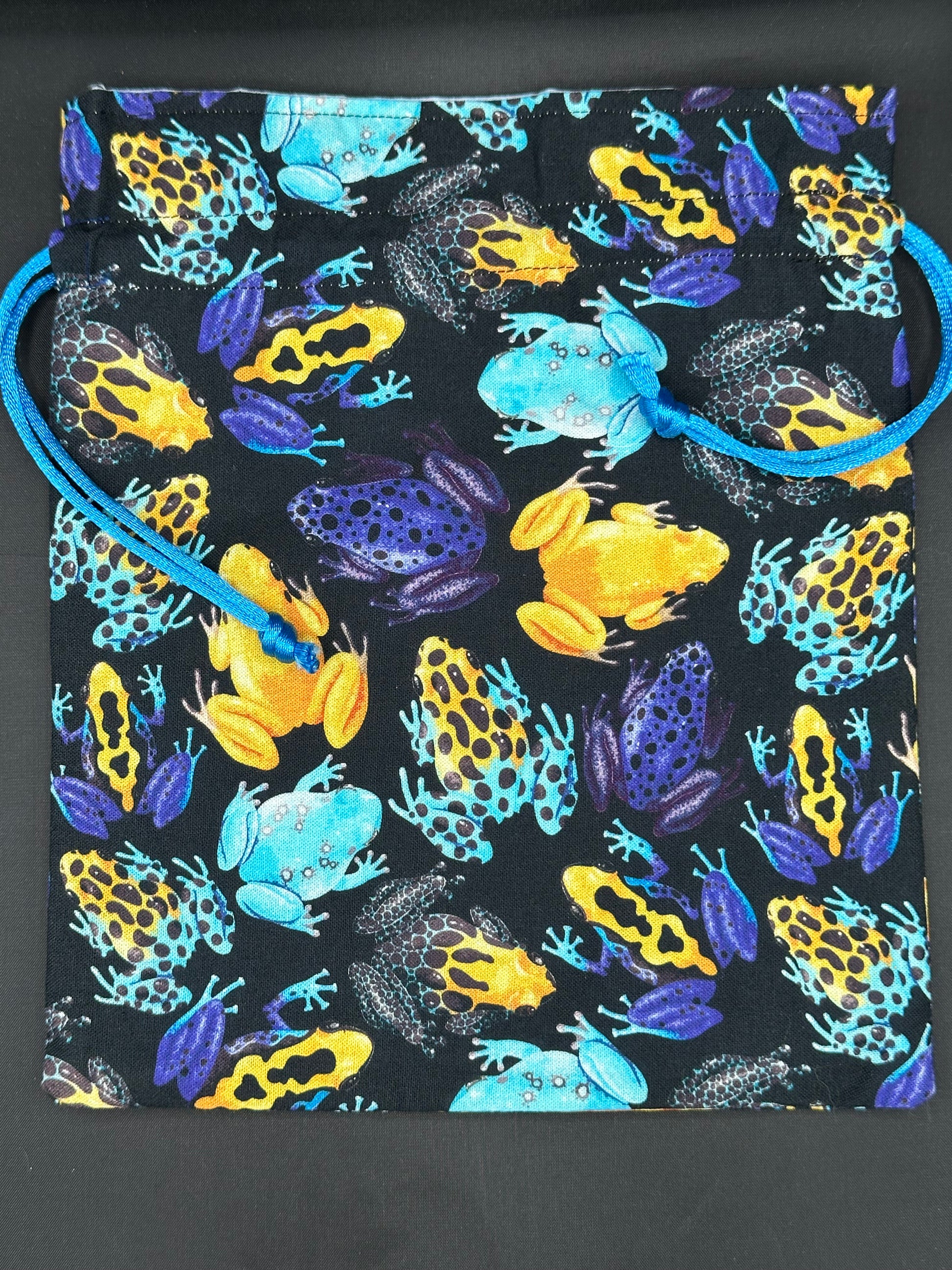 This is a draw string bag that is about 7 1/2 inches by 8 1/2 inches. These can be used to carry various items (ex: dice, pencils, pens, cosmetics, toys).