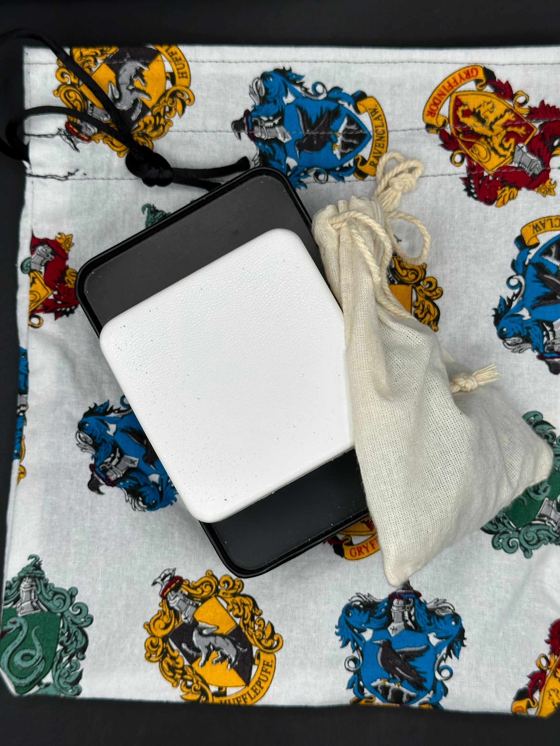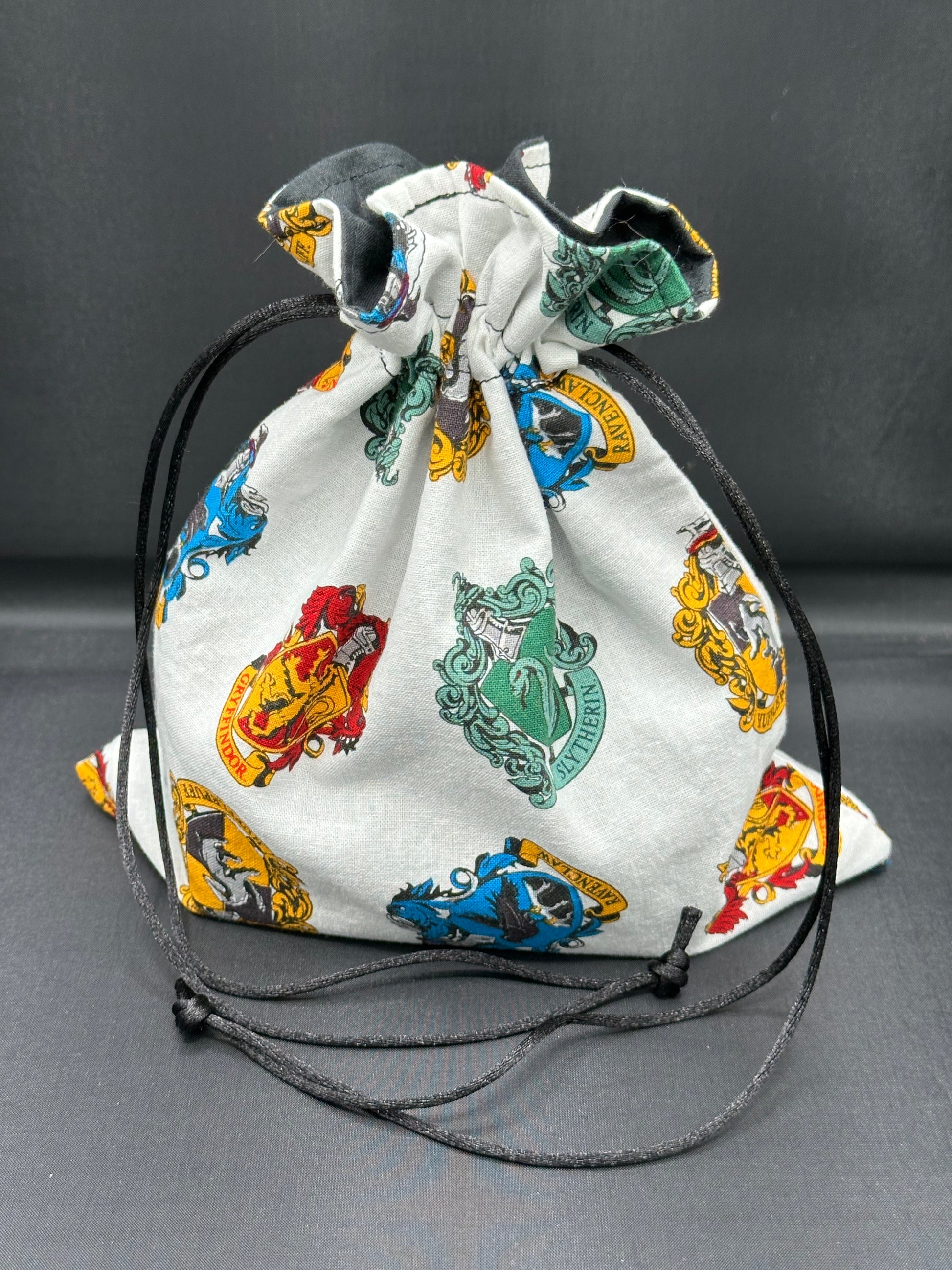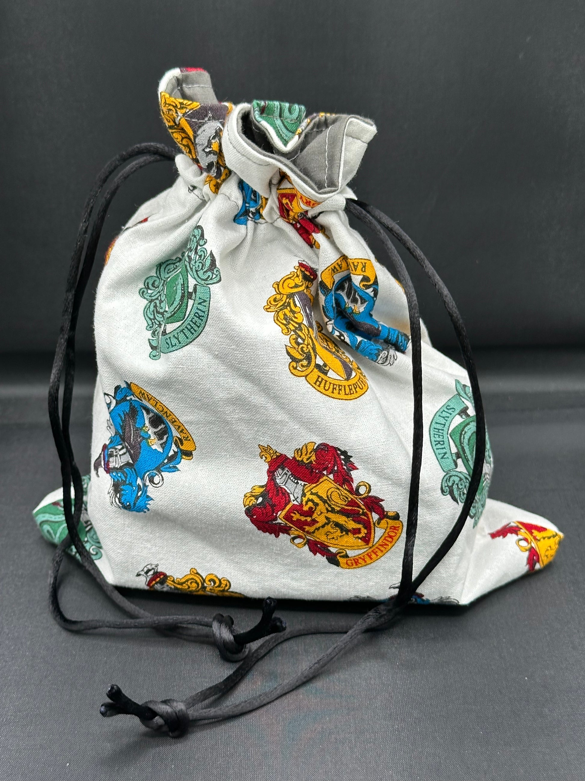 This is a draw string bag that is about 7 1/2 inches by 8 1/2 inches. These can be used to carry various items (ex: dice, pencils, pens, cosmetics, toys).