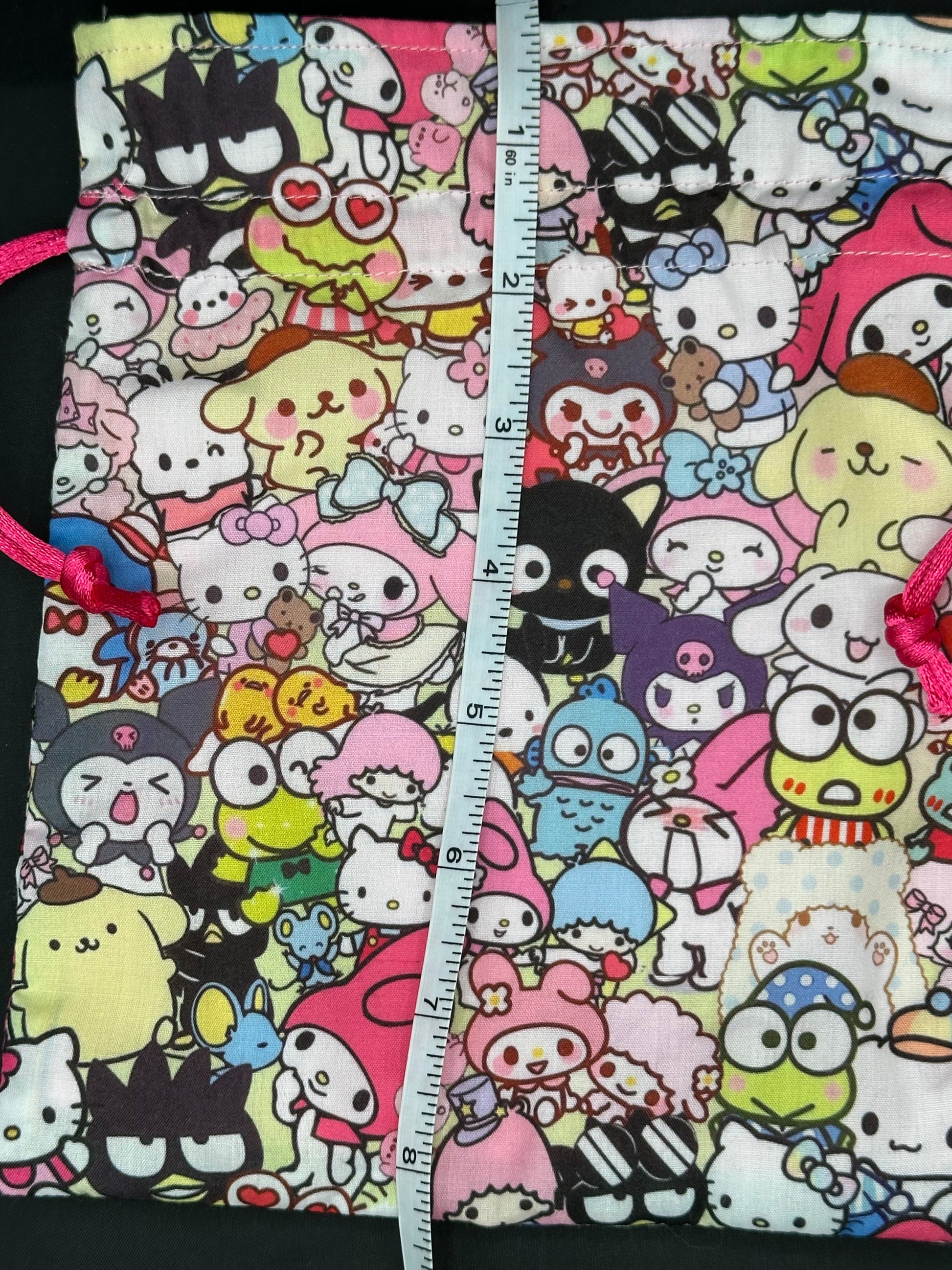 This is a draw string bag that is about 7 1/2 inches by 8 1/2 inches. These can be used to carry various items (ex: dice, pencils, pens, cosmetics, toys).