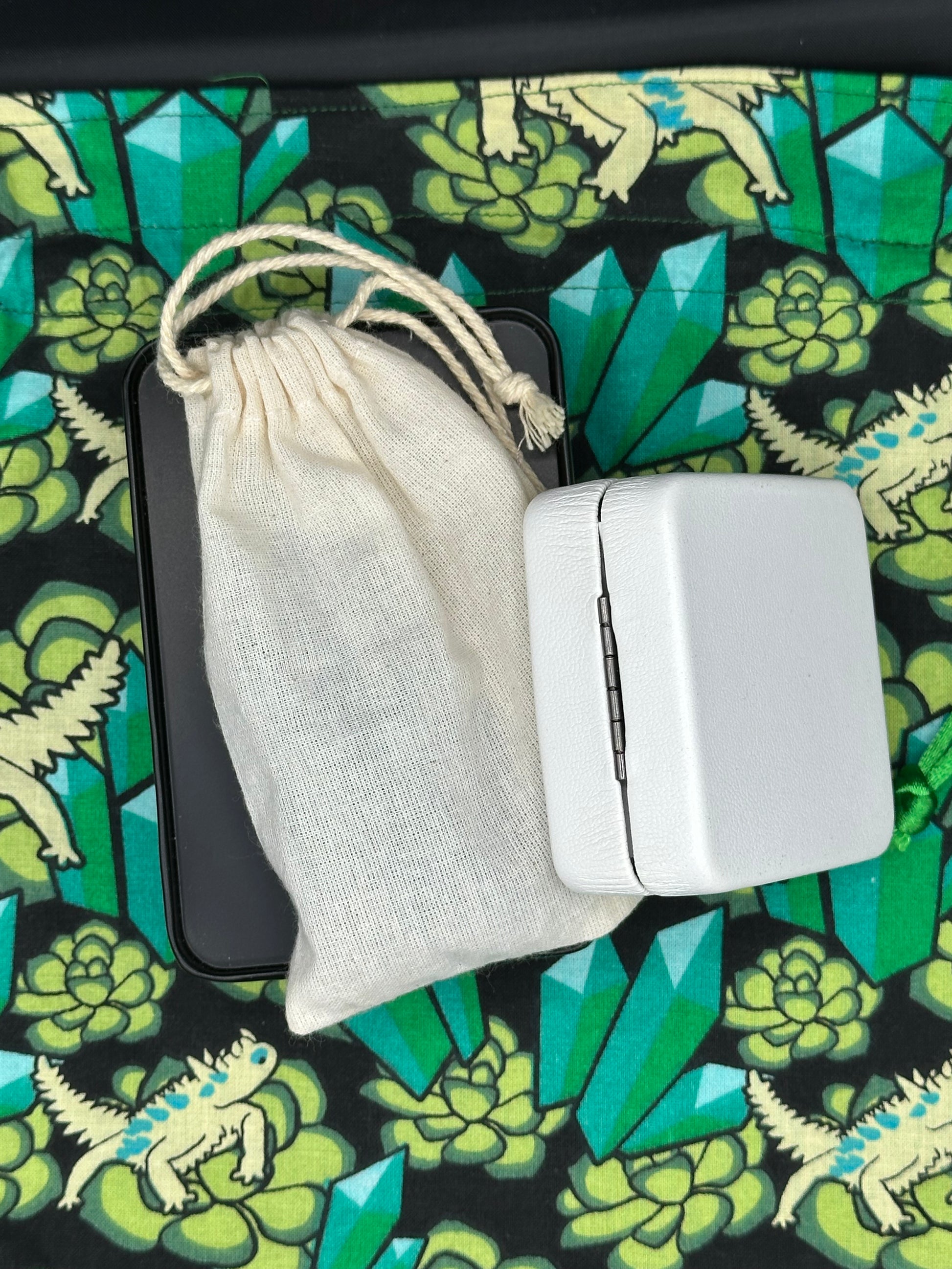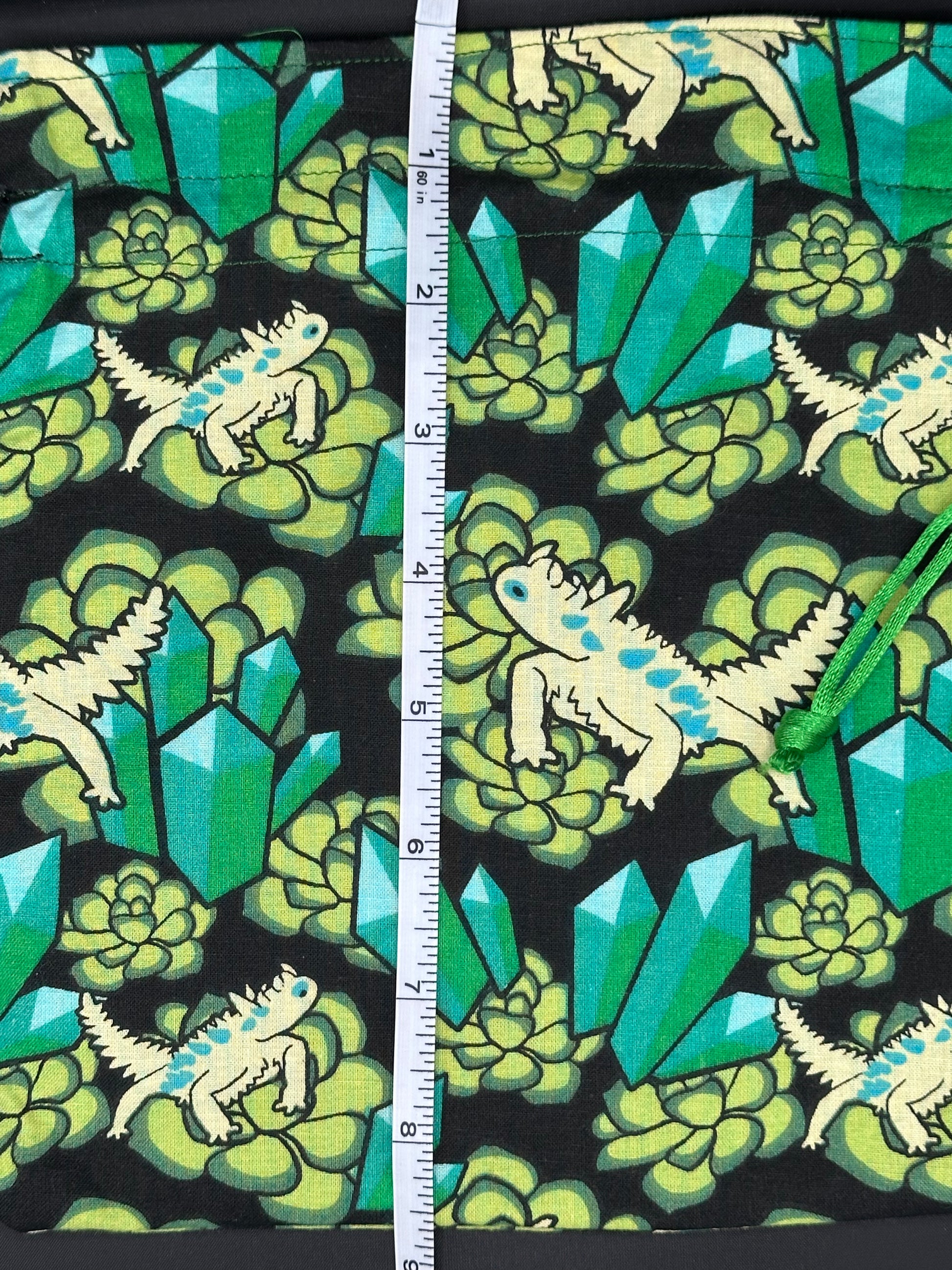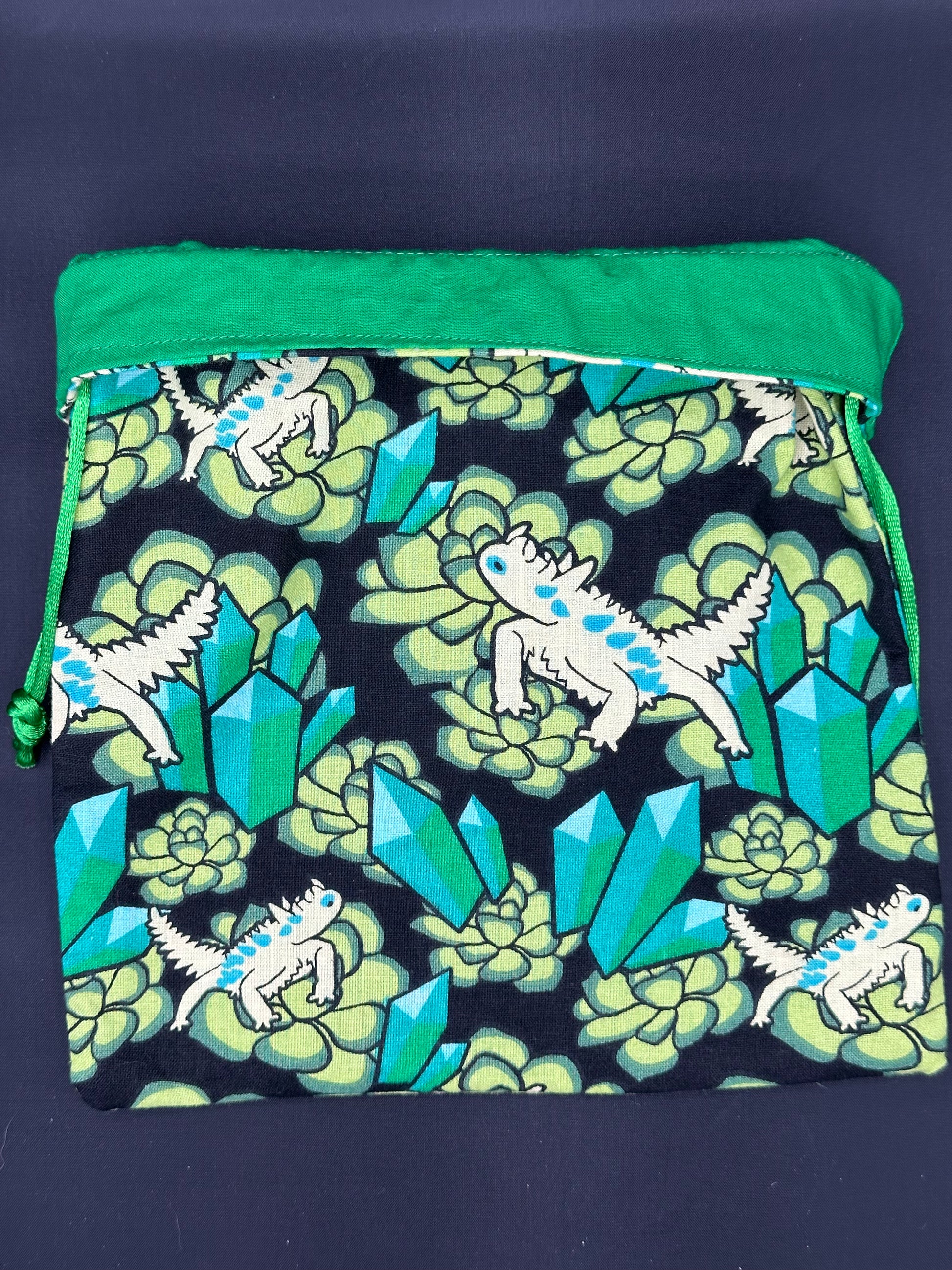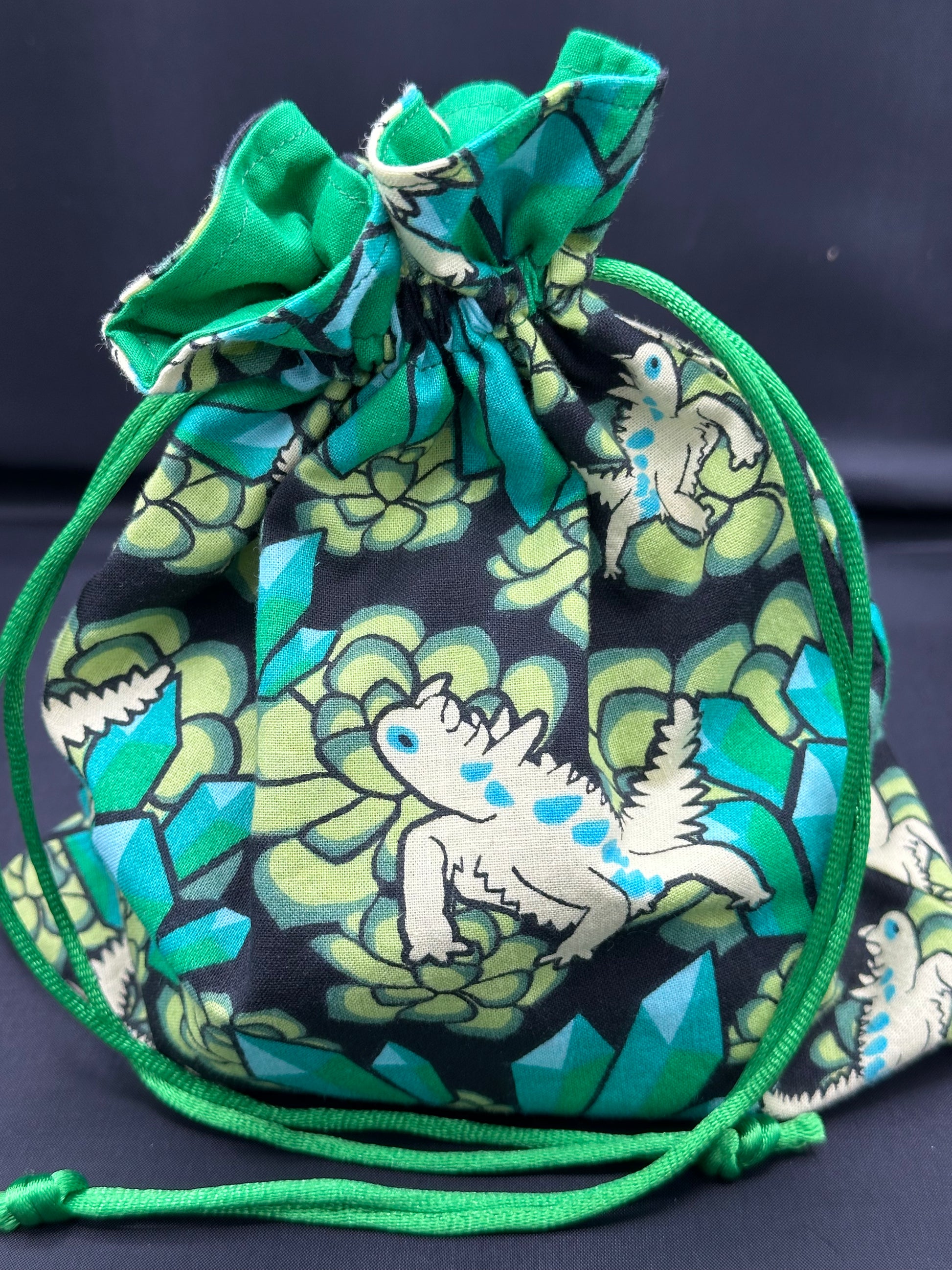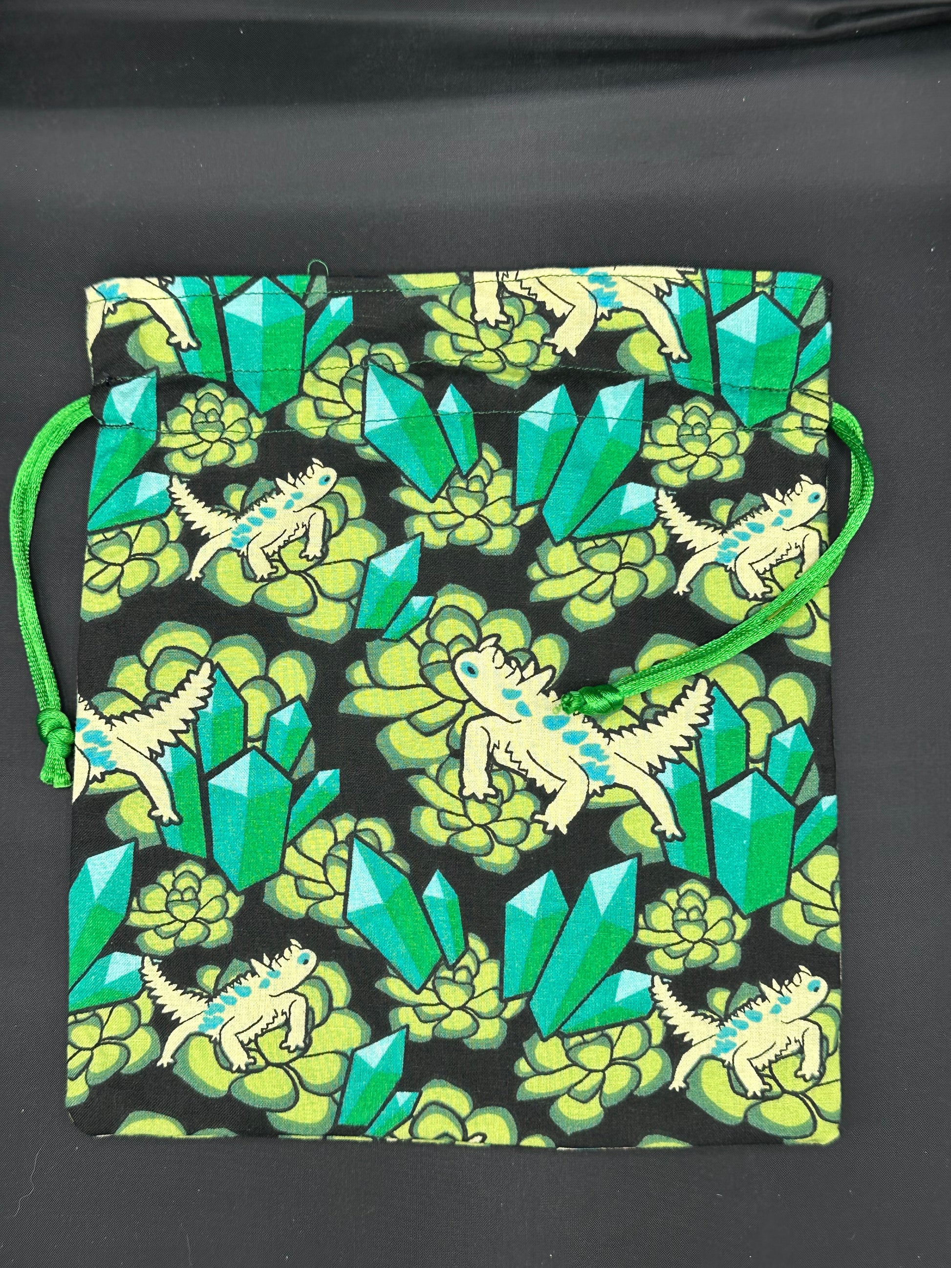 This is a draw string bag that is about 7 1/2 inches by 8 1/2 inches. These can be used to carry various items (ex: dice, pencils, pens, cosmetics, toys).