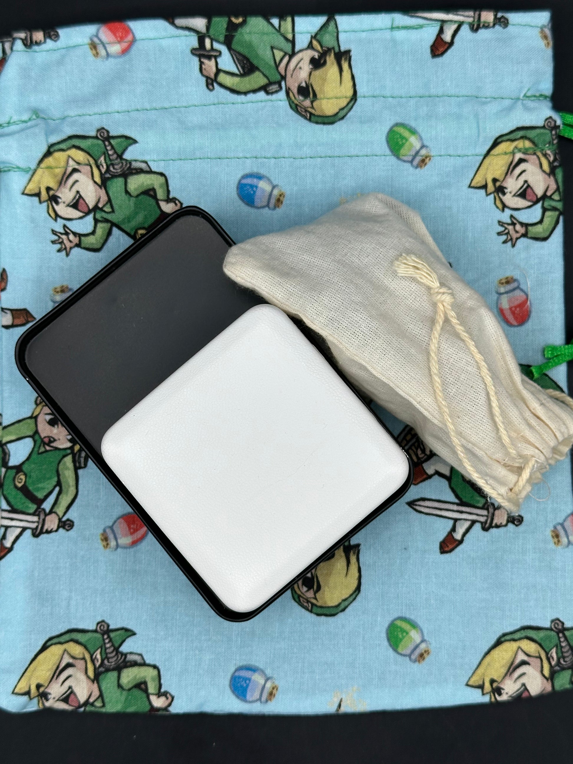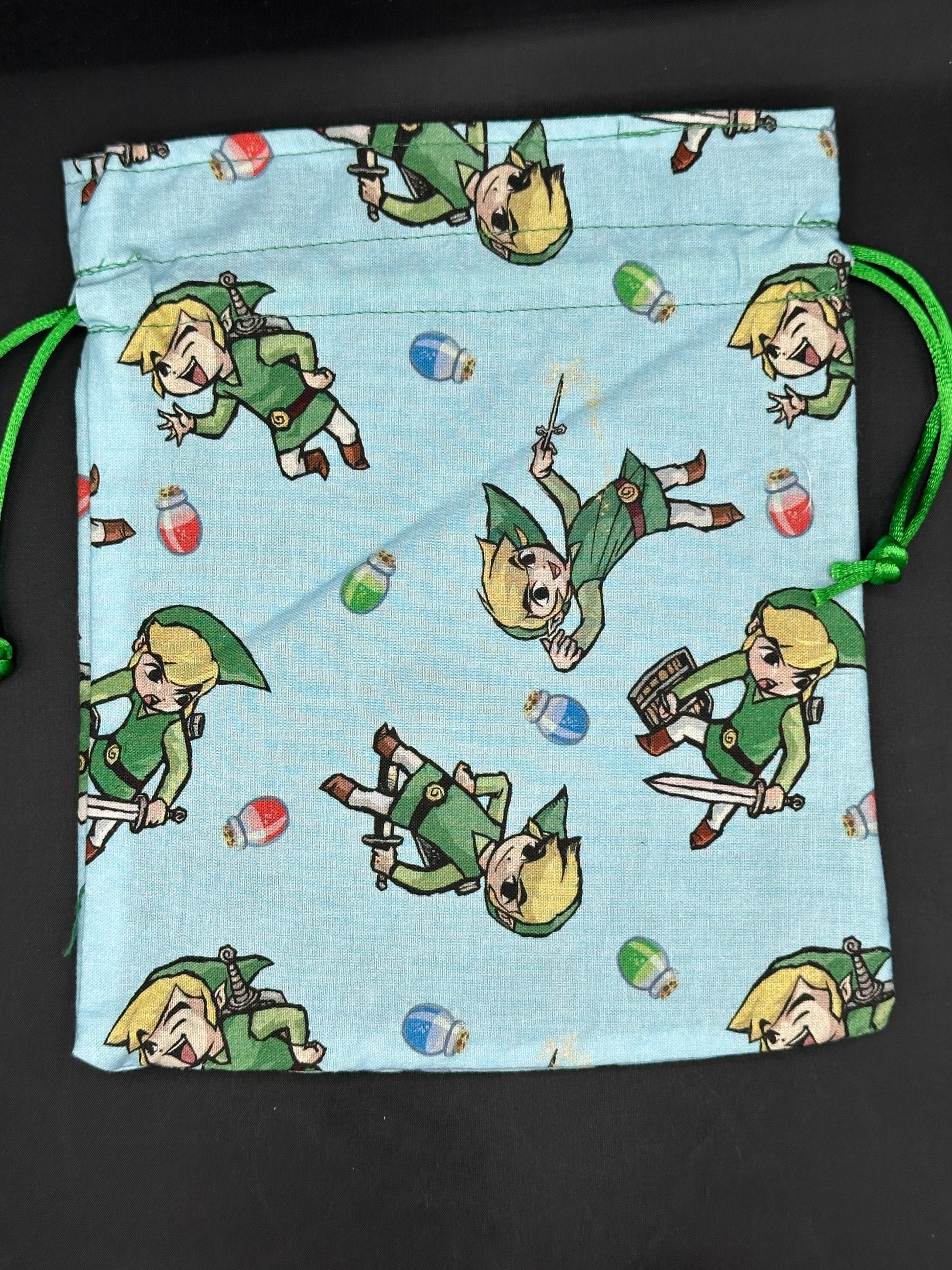 This is a draw string bag that is about 8 inches by 9 inches. These can be used to carry various items (ex: dice, pencils, pens, cosmetics, toys).