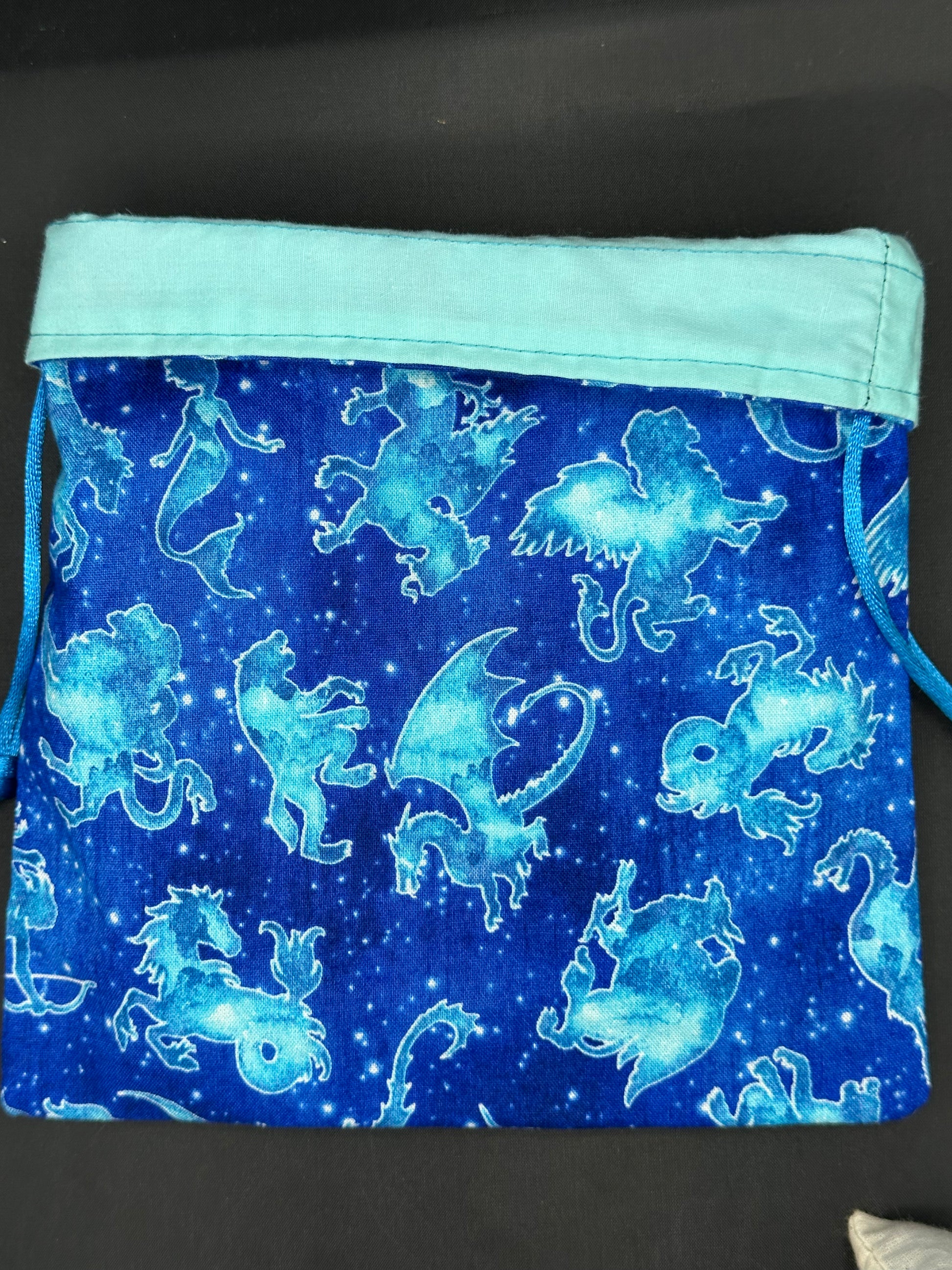 This is a draw string bag that is about 8 inches by 9 inches. These can be used to carry various items (ex: dice, pencils, pens, cosmetics, toys).