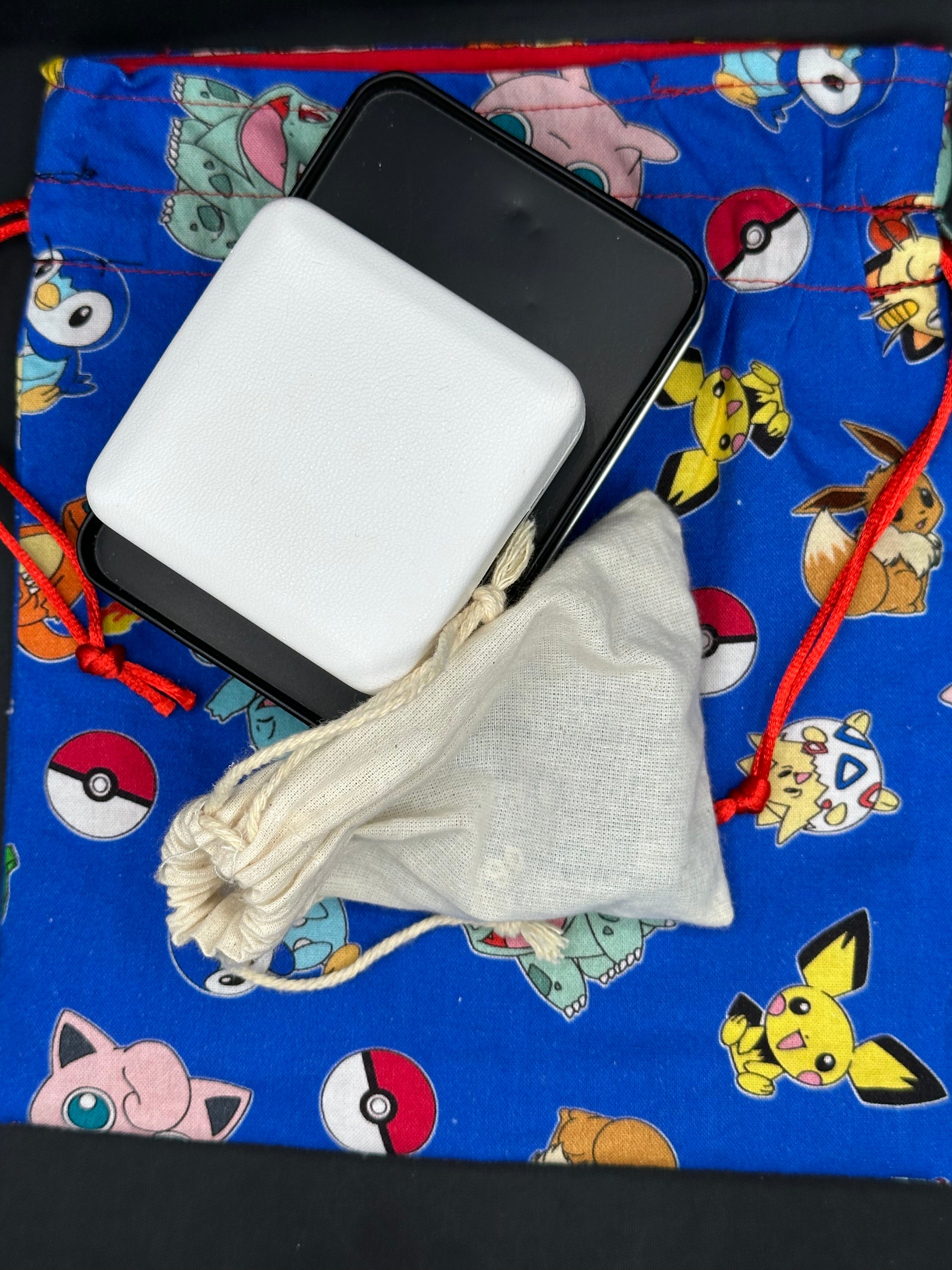 This is a draw string bag that is about 7 1/2 inches by 8 1/2 inches. These can be used to carry various items (ex: dice, pencils, pens, cosmetics, toys)