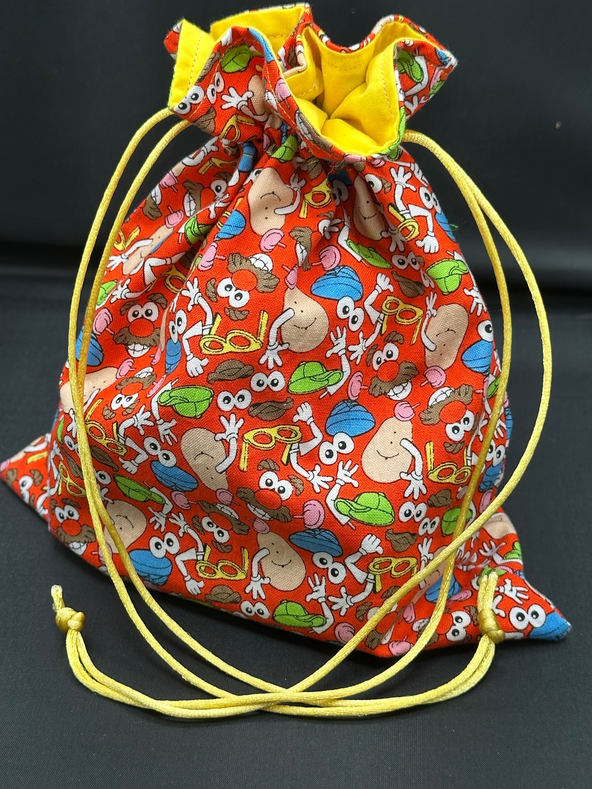 This is a draw string bag that is about 7 1/2 inches by 8 1/2 inches. These can be used to carry various items (ex: dice, pencils, pens, cosmetics, toys)