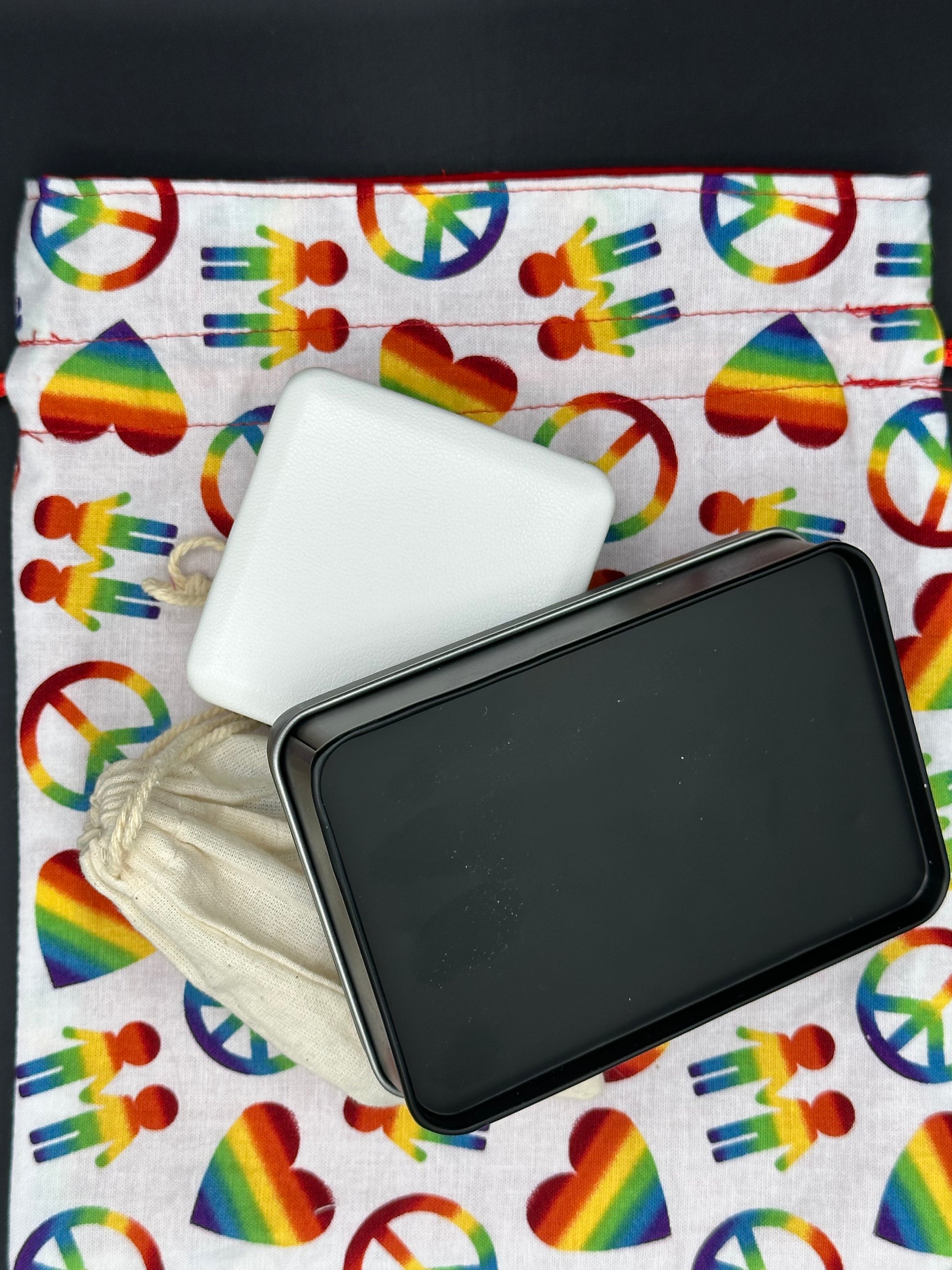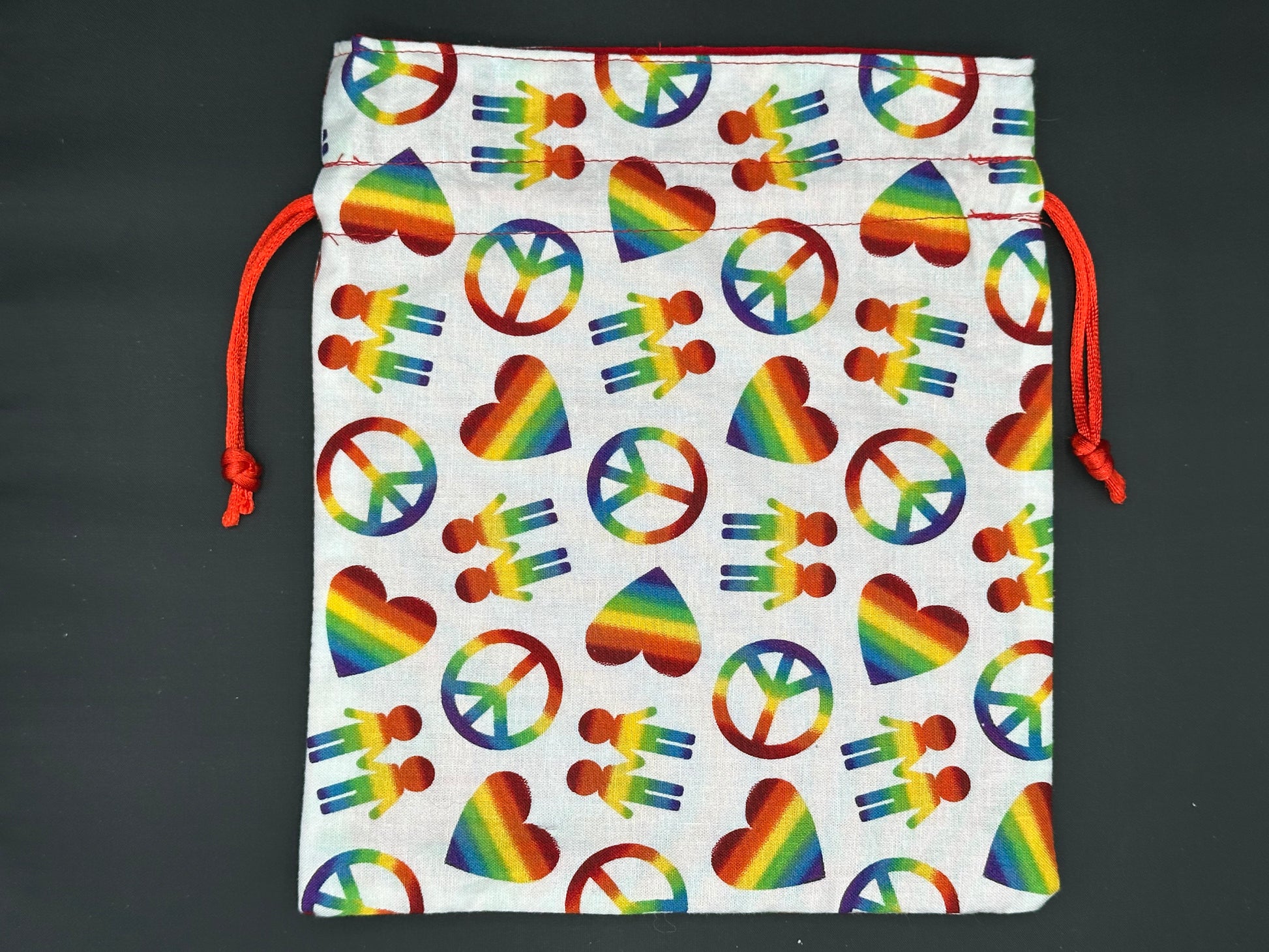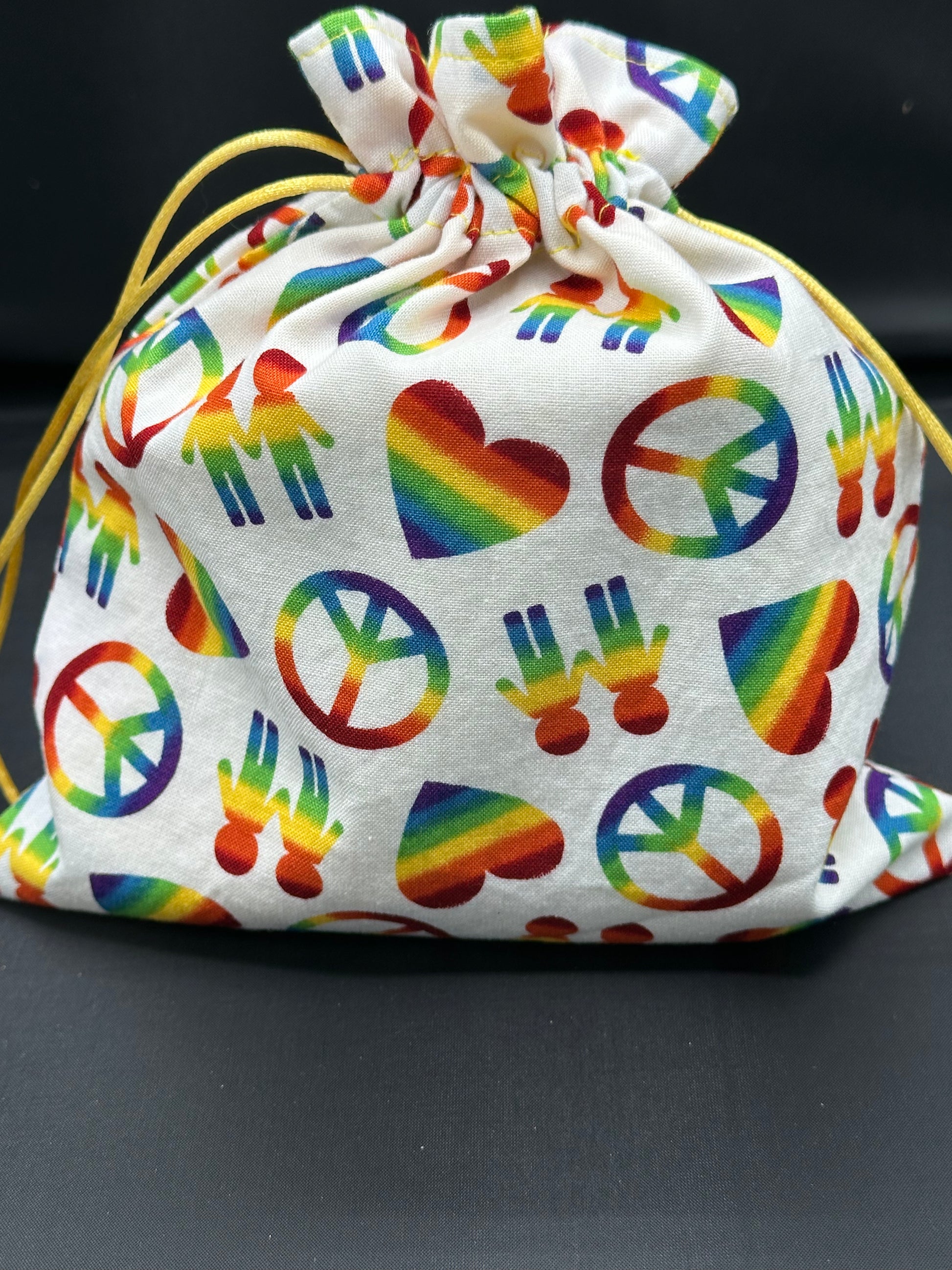 This is a draw string bag that is about 7 1/2 inches by 8 1/2 inches. These can be used to carry various items (ex: dice, pencils, pens, cosmetics, toys)