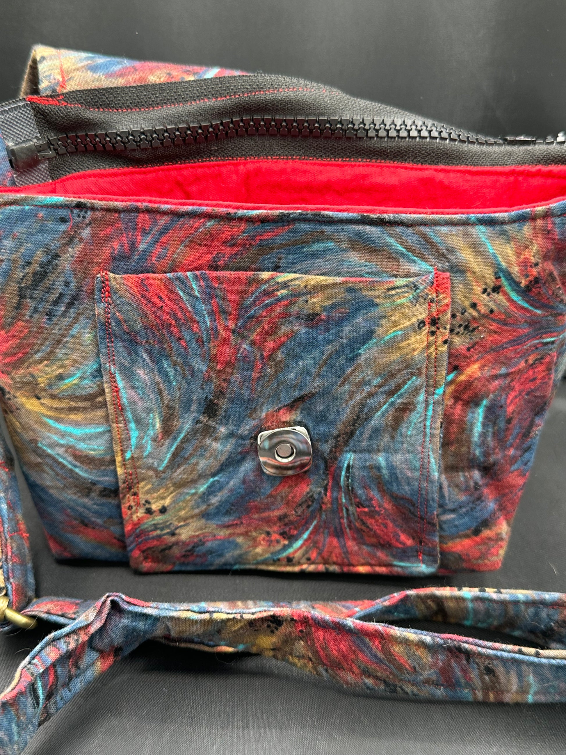 Purse finished size is approximately 8 inches wide by 6 inches. All purses have a main pocket and 2 interior pockets with an outside pocket that has the magnetic snap. All purses have zippers to allow the flap to detach and be replaced with another flap while not changing the main body of the purse.