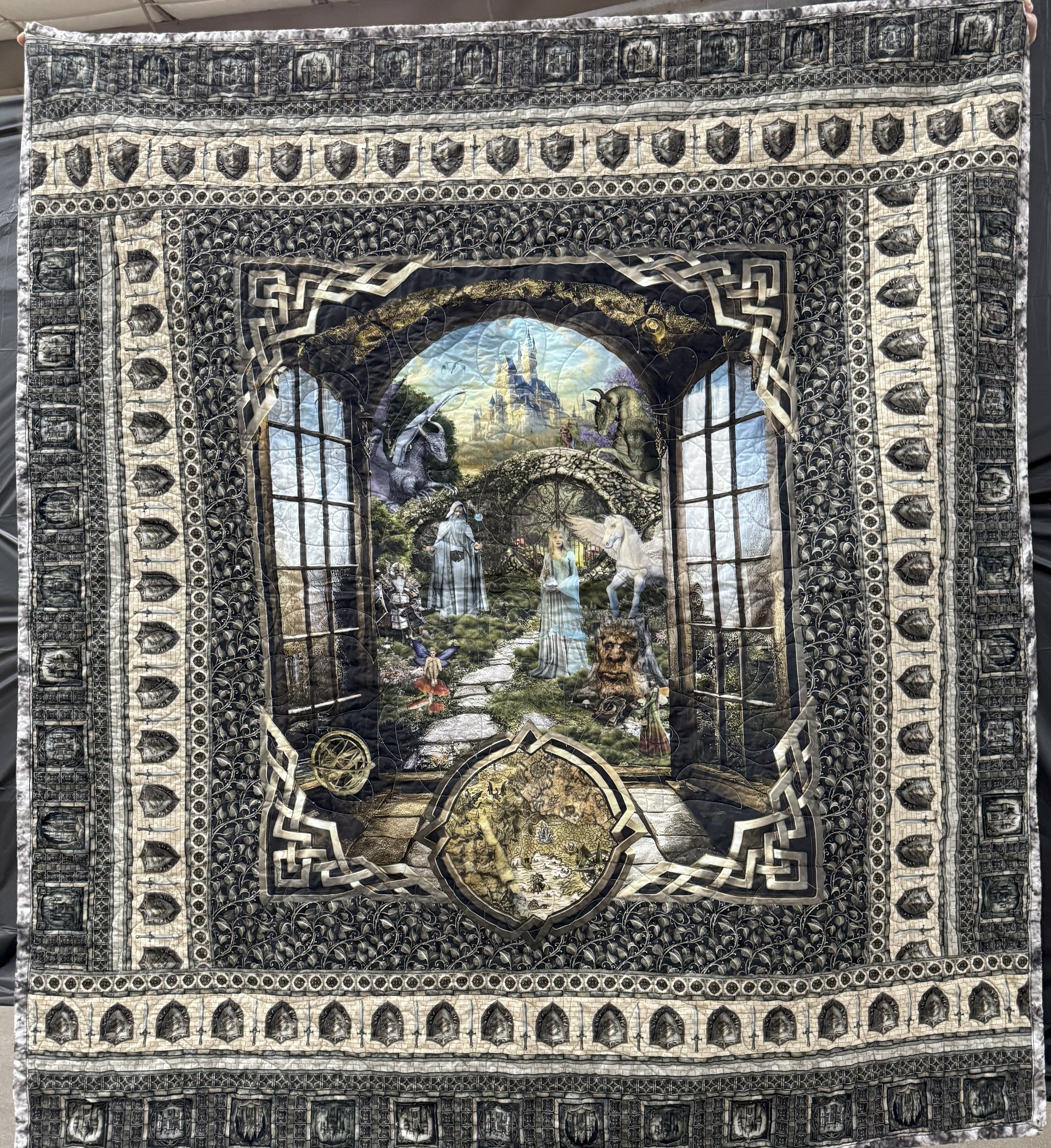Quilts are approximately throw size and are between 4 1/2 to 5 1/2 feet wide by 4 1/2 to 5 1/2 feet long.