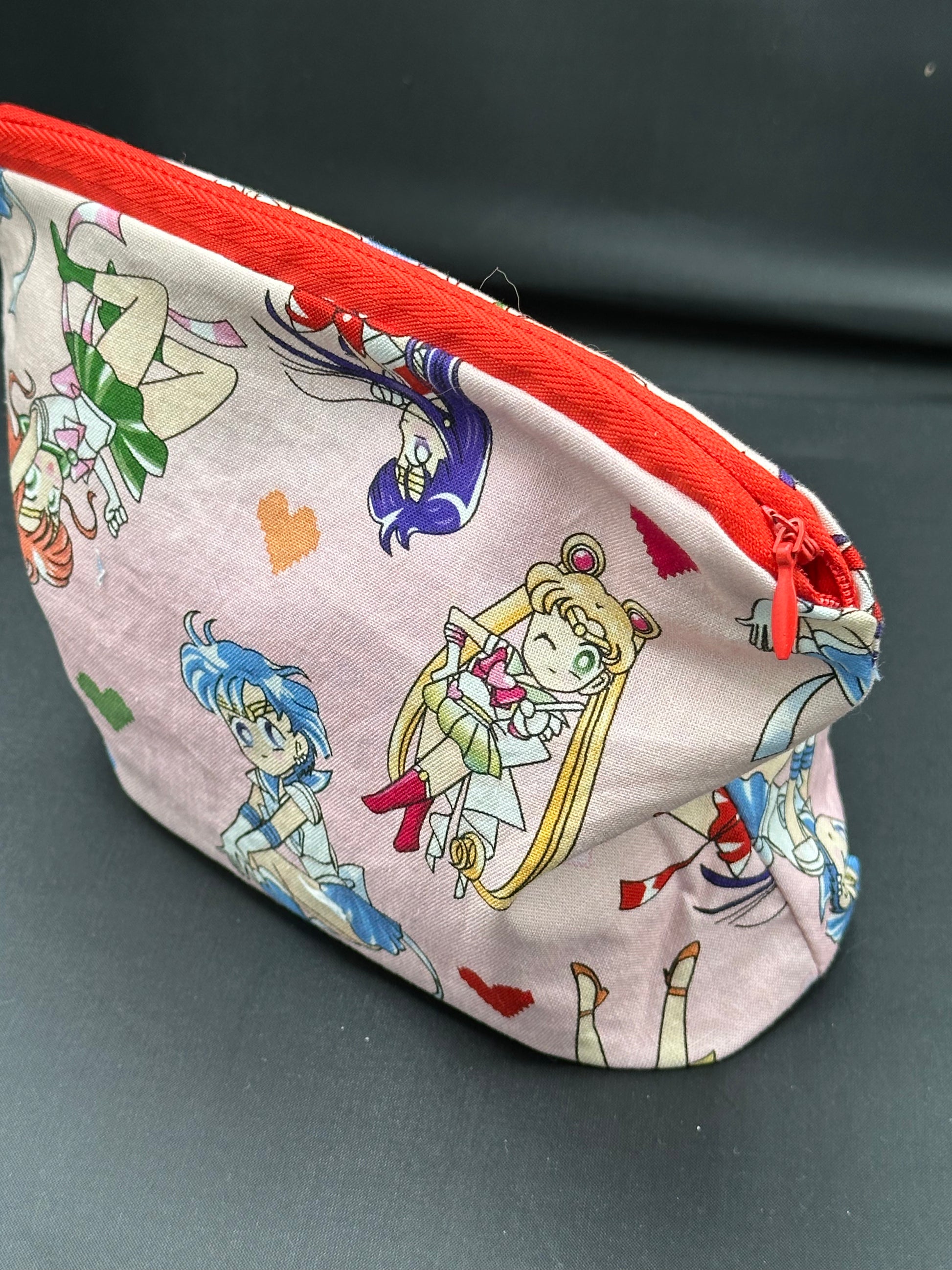 The finished product is about 7 inches by 7 inches. The bottom corners have been made to form a box look to give it a bigger bottom. These can be used to carry various items (ex: pencils, pens, cosmetics, toys)