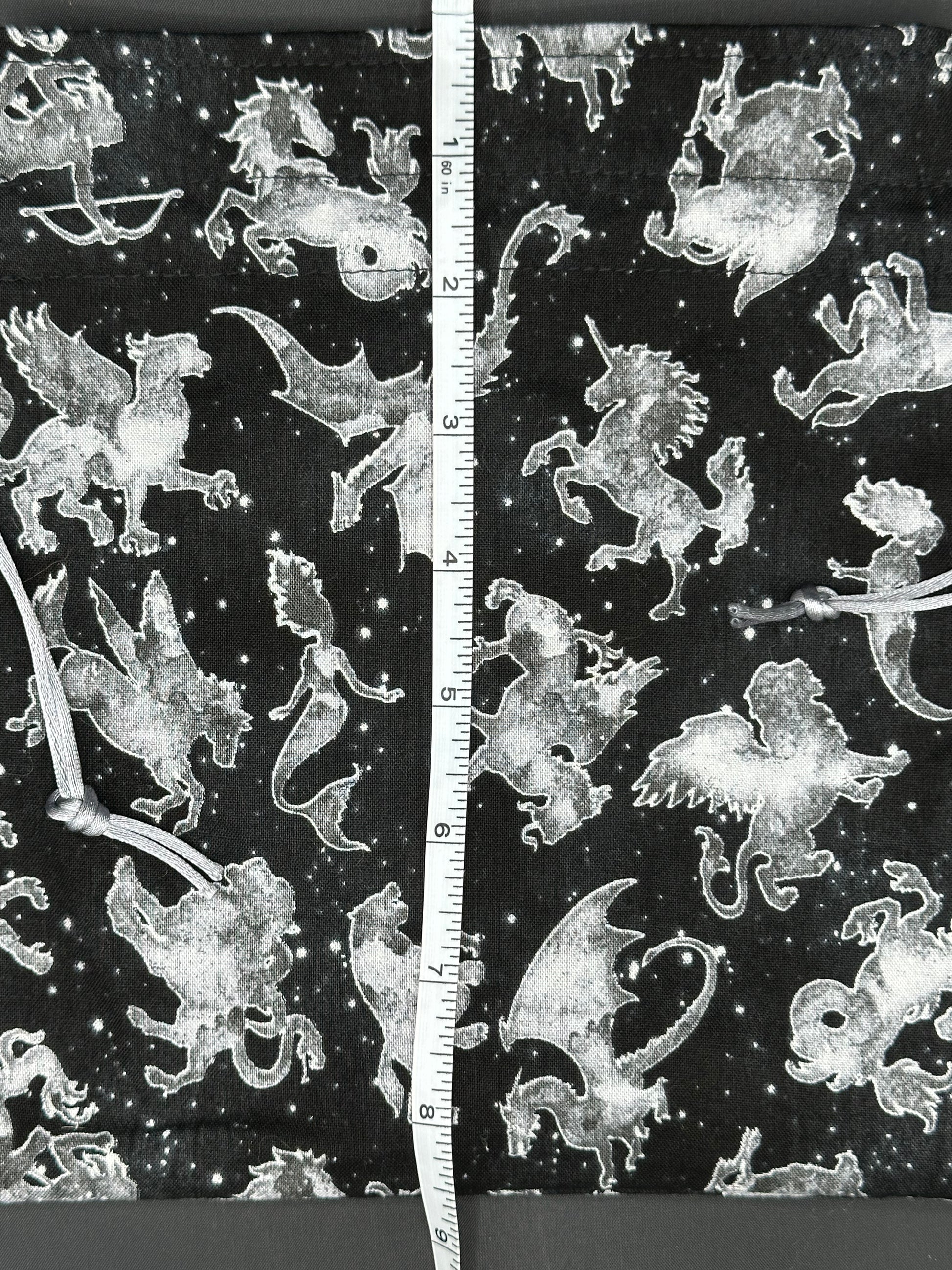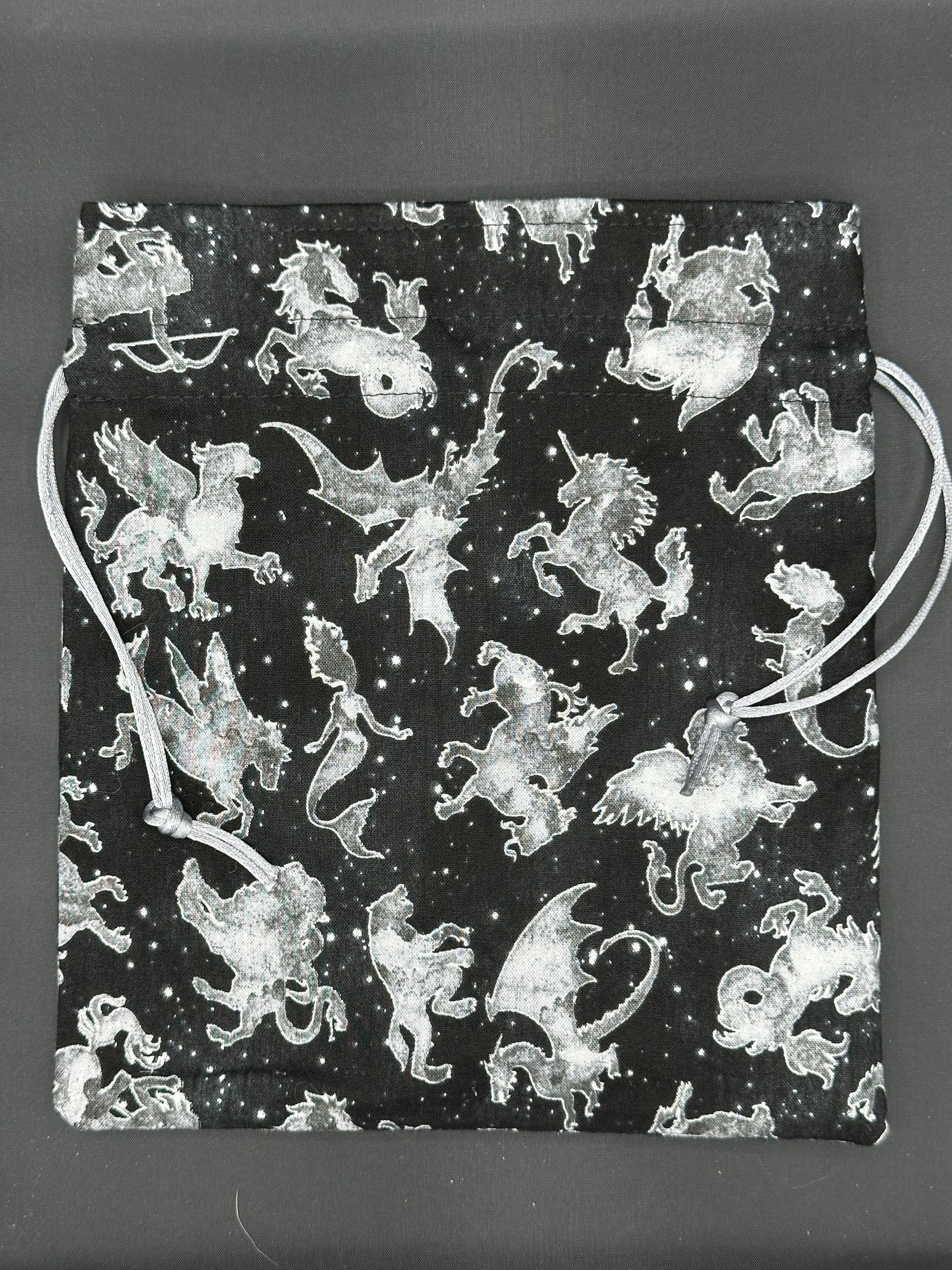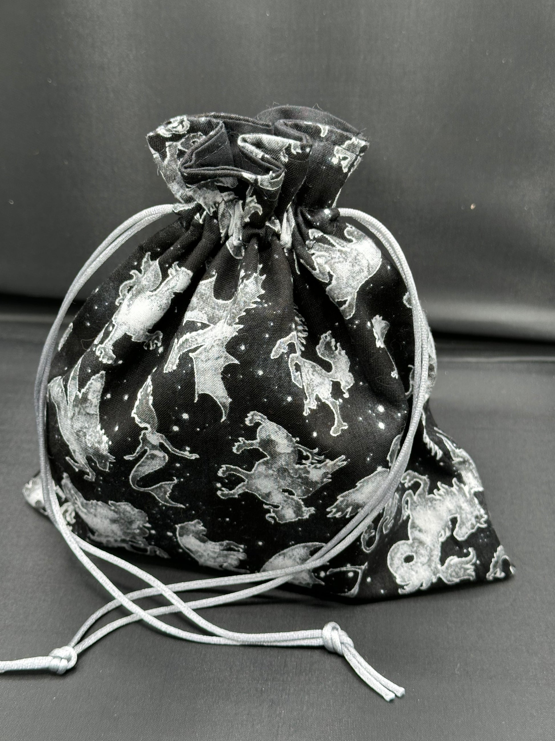 This is a draw string bag that is about 7 1/2 inches by 8 1/2 inches. These can be used to carry various items (ex: dice, pencils, pens, cosmetics, toys)