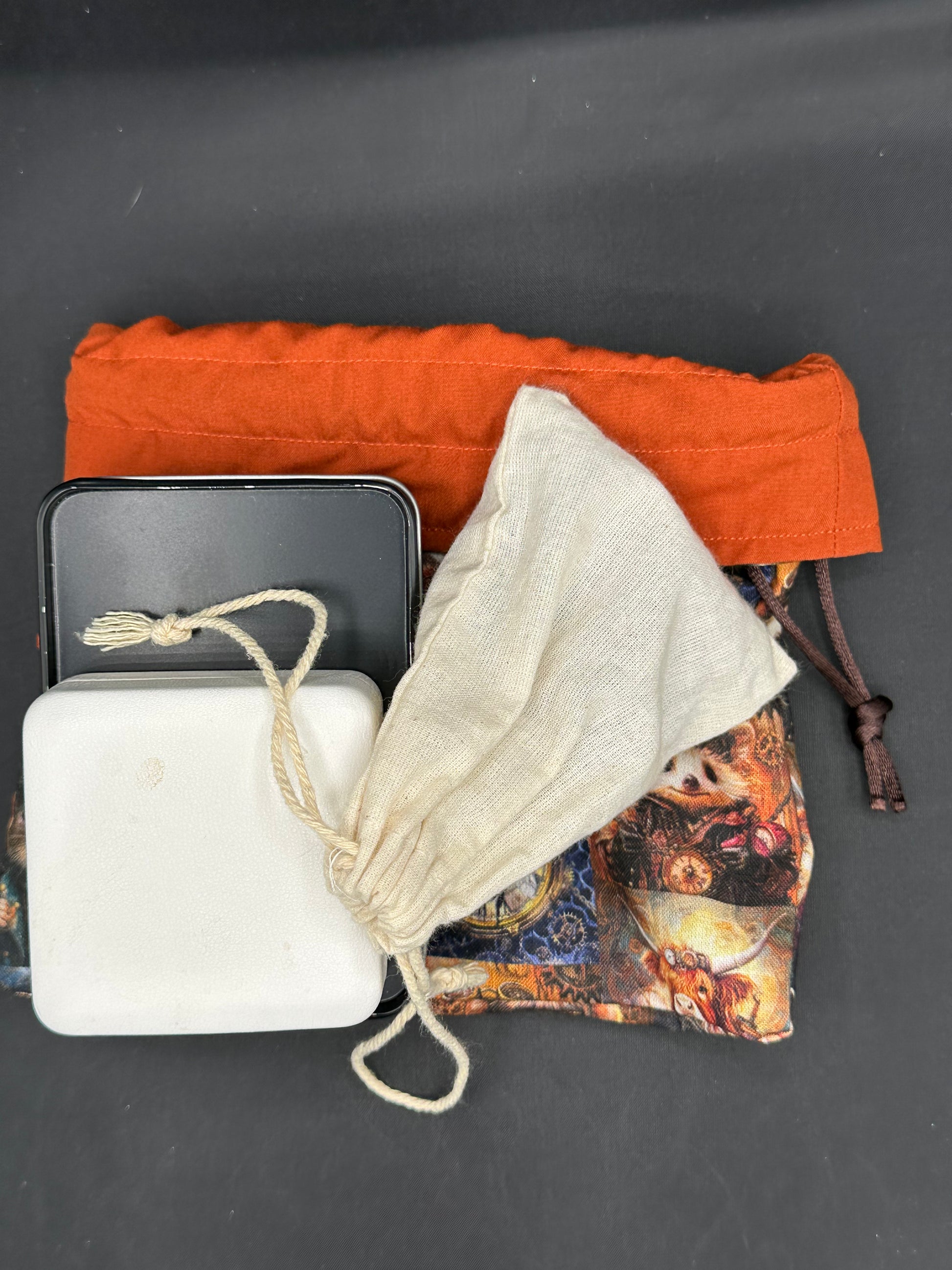 This is a draw string bag that is about 8 inches by 9 inches. These can be used to carry various items (ex: dice, pencils, pens, cosmetics, toys).