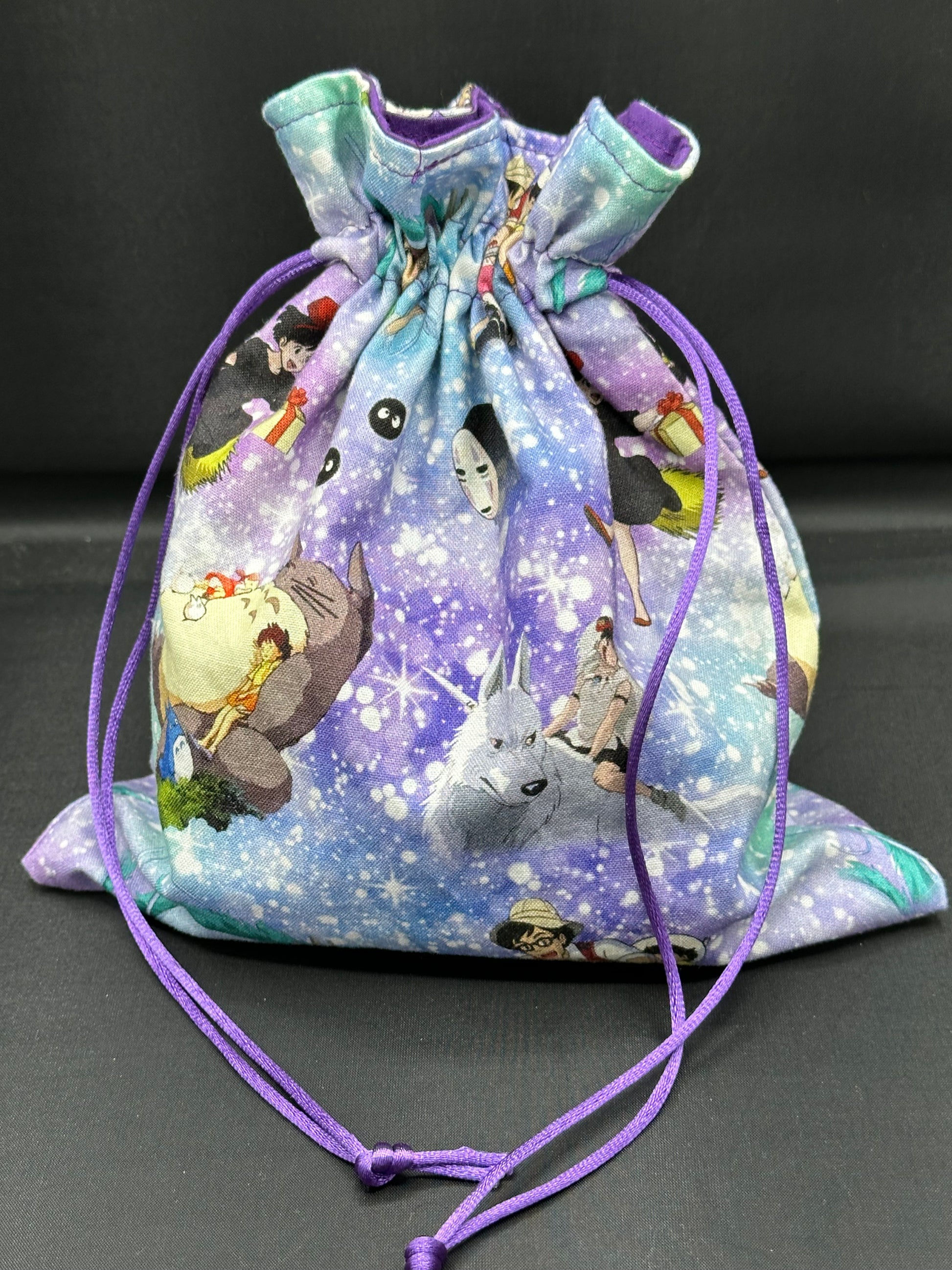 This is a draw string bag that is about 8 inches by 9 inches. These can be used to carry various items (ex: dice, pencils, pens, cosmetics, toys).